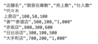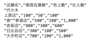 - 数値以外をWクォート文字で囲む。店舗名やカンマ区切りの数値が文字列として扱われる