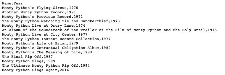 # >> {'Name': "Monty Python's Previous Record", 'Year': '1972'}