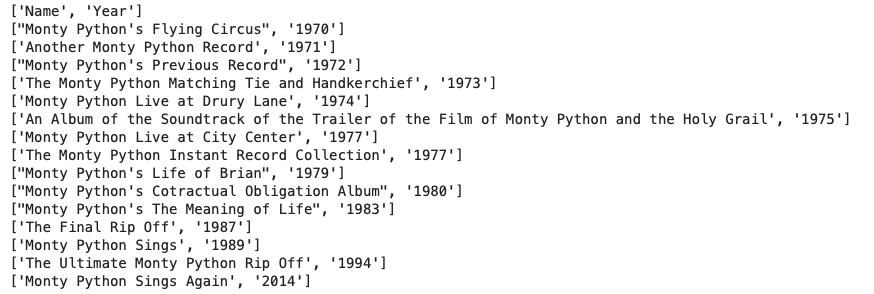 # >> {'Name': 'The Monty Python Matching Tie and Handkerchief', 'Year': '1973'}
