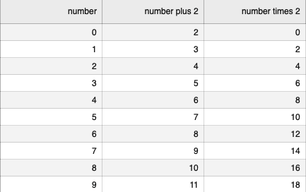 writer.writerow(('number', 'number plus 2', 'number times 2'))
