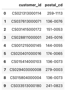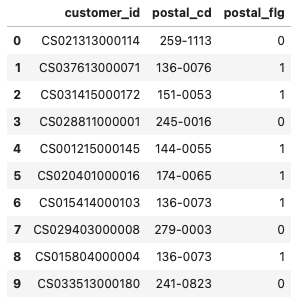 df['postal_flg'] = df['postal_cd'].apply(lambda x: 1 if 100 <= int(x[0:3]) <= 209 else 0).rename('postal_flg')