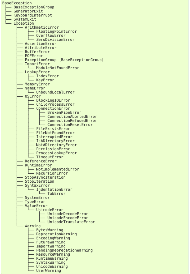 - 一番上に BaseException がある。どんなエラーが発生するかわからない場合は、上位階層の Exception を処理するようにすると、意図しないエラーもキャッチして処理できる