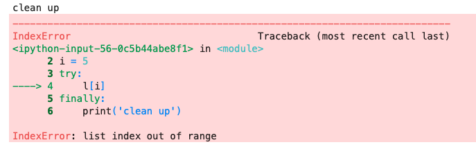 # clean up- エラーが処理されずプログラムが中断した場合でも、finallyの処理は実行される
