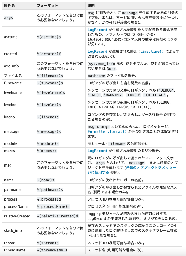- 注意点は、import したモジュールのログを取るなどの目的がなければ、このケースでは logging (親) の logging.basicConfig(~) は記載しない書き方がベター。