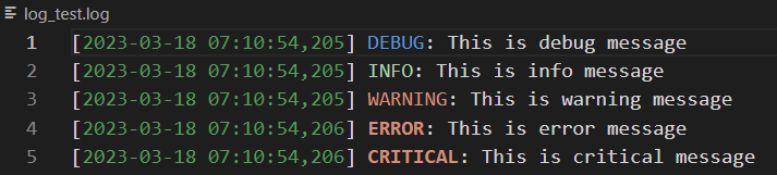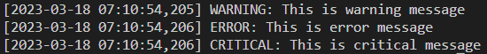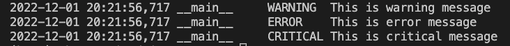 | WARNING | 想定外のことが起こった、または問題が近く起こりそうなとき(プログラムは動いている) デフォルトではWARNINGレベル以上がログに残る |