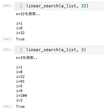 - 線形探索では、データセットの「全要素」について繰り返し、探索対象と比較する