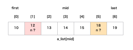 - まず中央値(a_list[mid])を見つける(ここでは14になる)