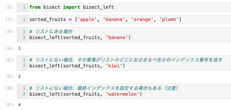 # bisect_leftの場合、リストにない場合も戻り値がある(本来あるべき場所のインデックス番号)
