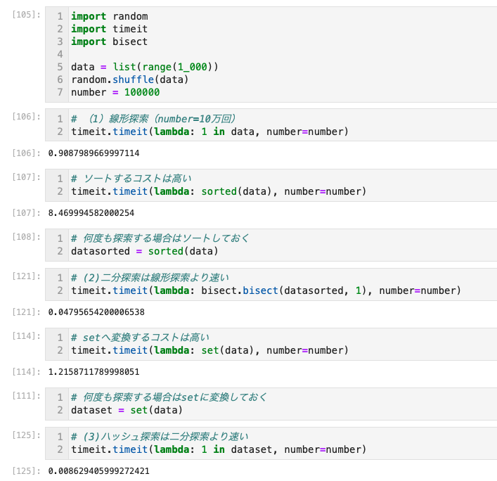 listとsetのどちらがデータ探索に適したデータ型なのかを判断できる(で、どっち?) - ただし、効率の良いアルゴリズムを使うためだとしても、list型を探索のためにソートしたりsetに変換する準備をするのは非効率