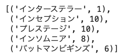ratings_list = [1, 10, 10, 8, 6]list(zip(movie_list, ratings_list))