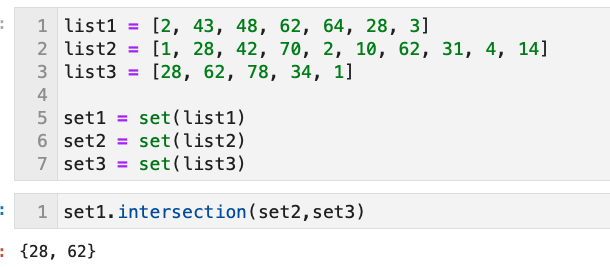 setにはintersectionメソッドがあり、2つのsetで共通する要素を返してくれる listをsetに変換する