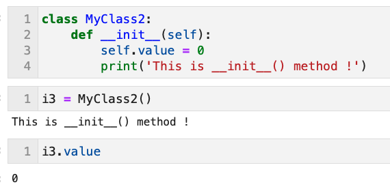 - 初期化メソッド __init__(self) はインスタンス生成時に自動的に実行される