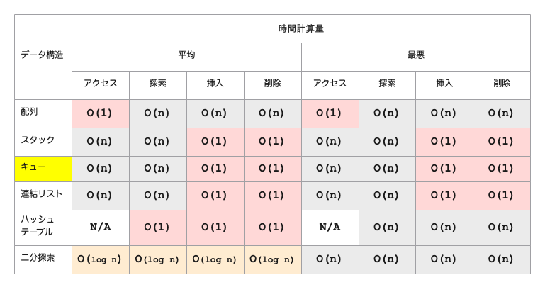 - キューのサイズに関係なく、エンキューとデキューの計算量はともに O(1)