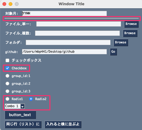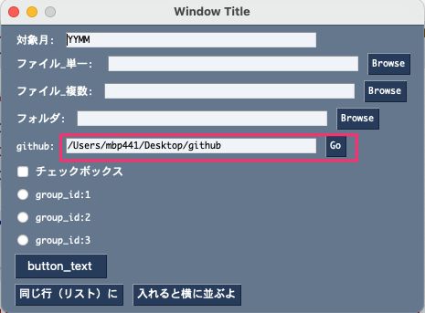 [sg.Text('github:'), sg.Input(r"/Users/〜〜〜/Desktop/github", key='-open_github-'), sg.Button('Go')],
